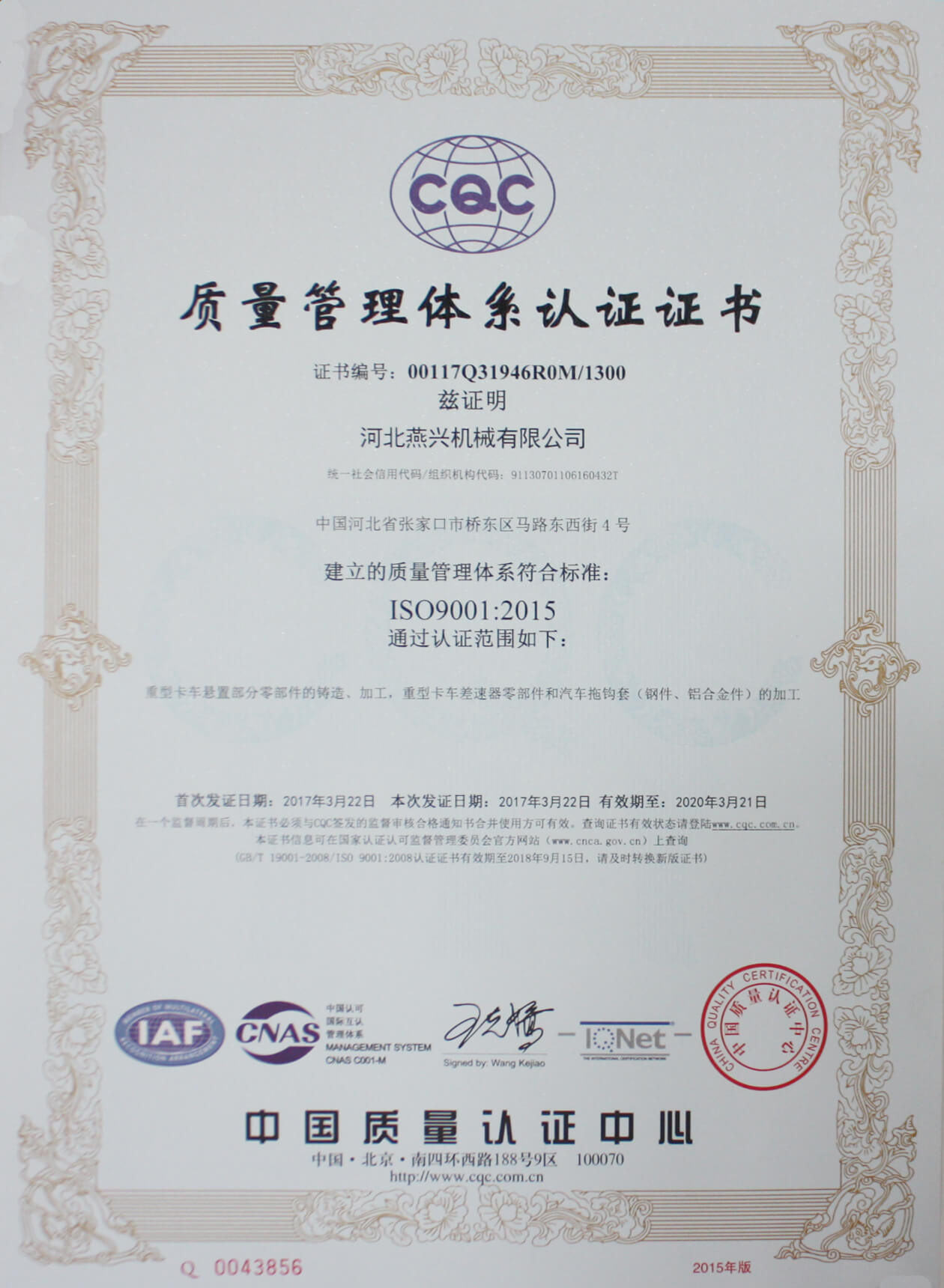 質量管理體系認證證書